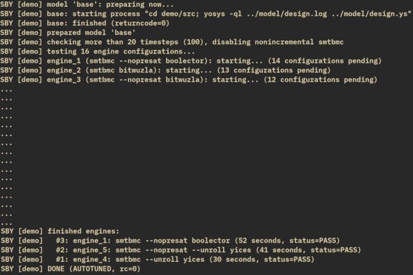 The new -autotune option, by contrast, runs through a range of recommended engine and solver combinations to produce a report on their relative performance - alongside a configuration which can be quickly copy-and-pasted into an .sby file to default to the best-performing option.